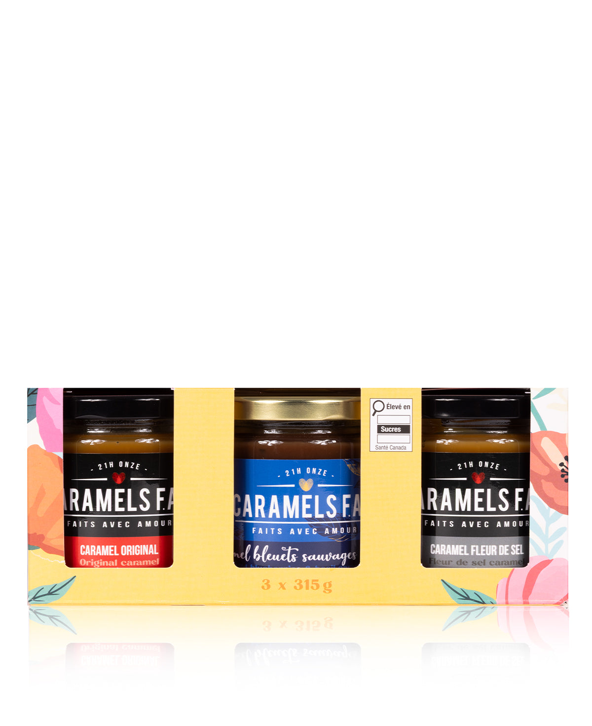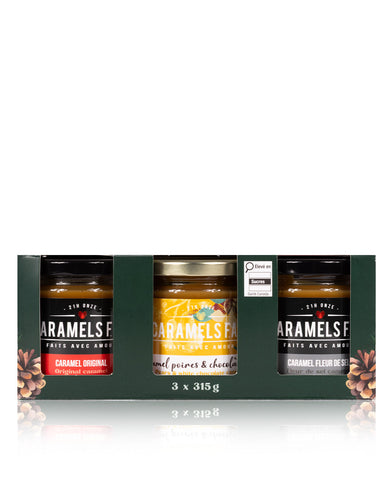 Découvrez notre Trilogie Caramel, un coffret exclusif réunissant trois déclinaisons de notre caramel fondant : l’intensité du caramel original, l’équilibre parfait du caramel fleur de sel et la douceur réconfortante du caramel au sirop d’érable.